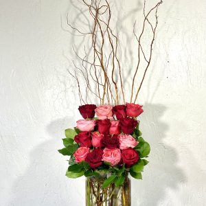 • Modern Love Flower Arrangement. Tall glass vase filled with rows of assorted roses with curly willow.