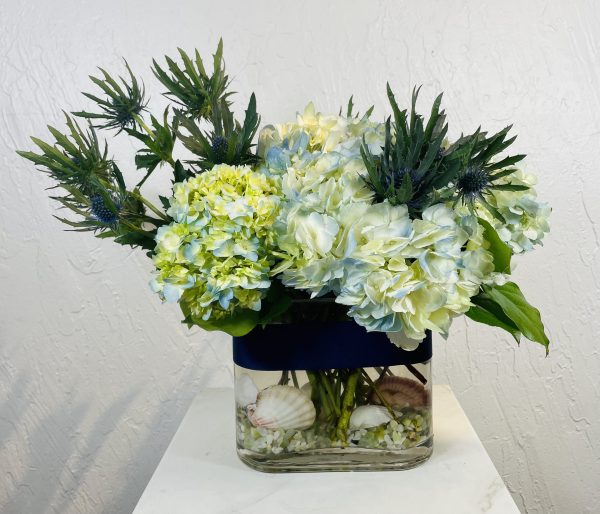 An arrangement of blue hydrangea with thistle accents featured in a jade rock and shell beach scape.