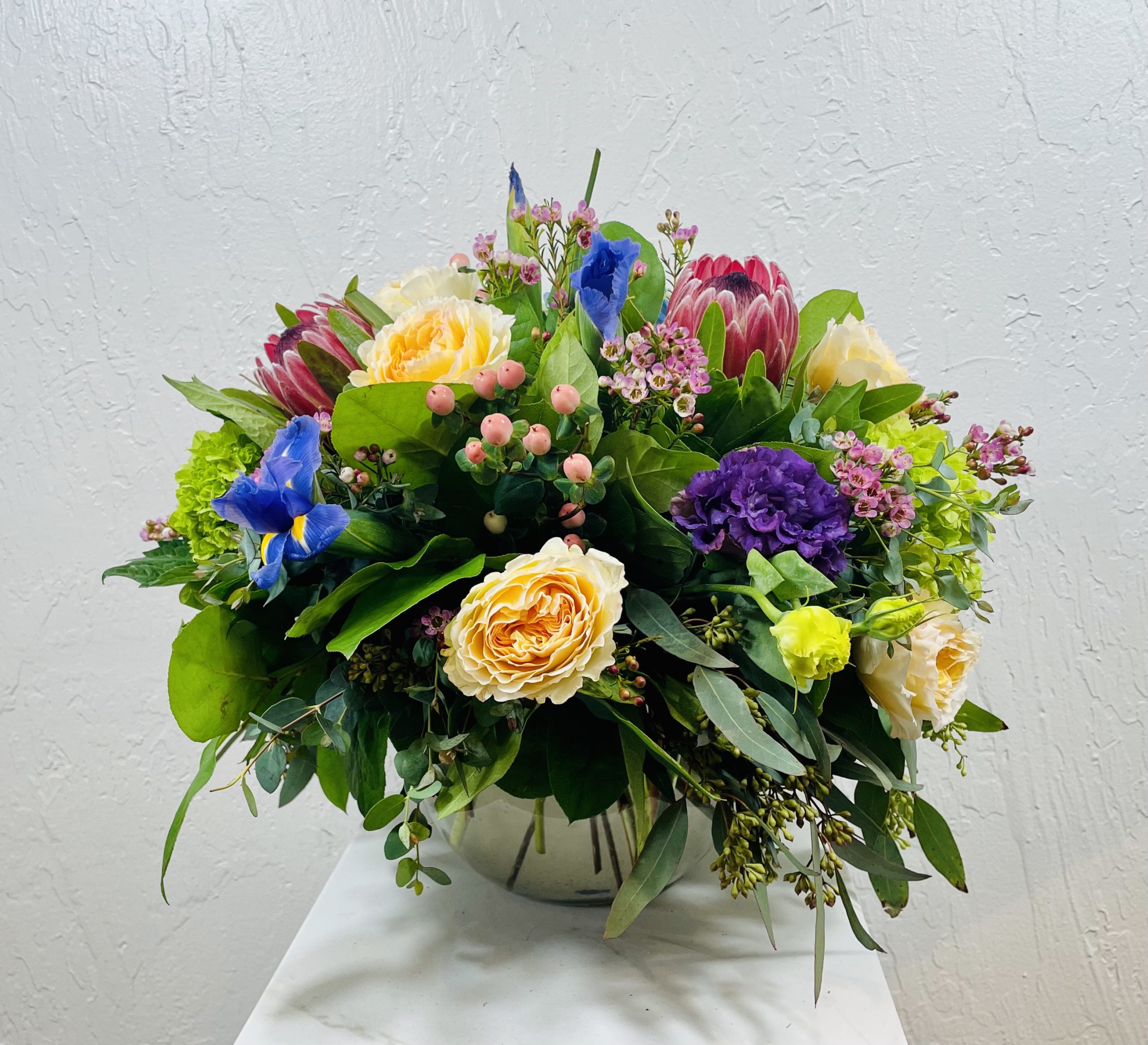 Layers of vivid blooms present a visual rainbow! Blue and Green Hydrangea, garden roses, lisianthus, protea, iris and hypericum pack a powerful punch of color.