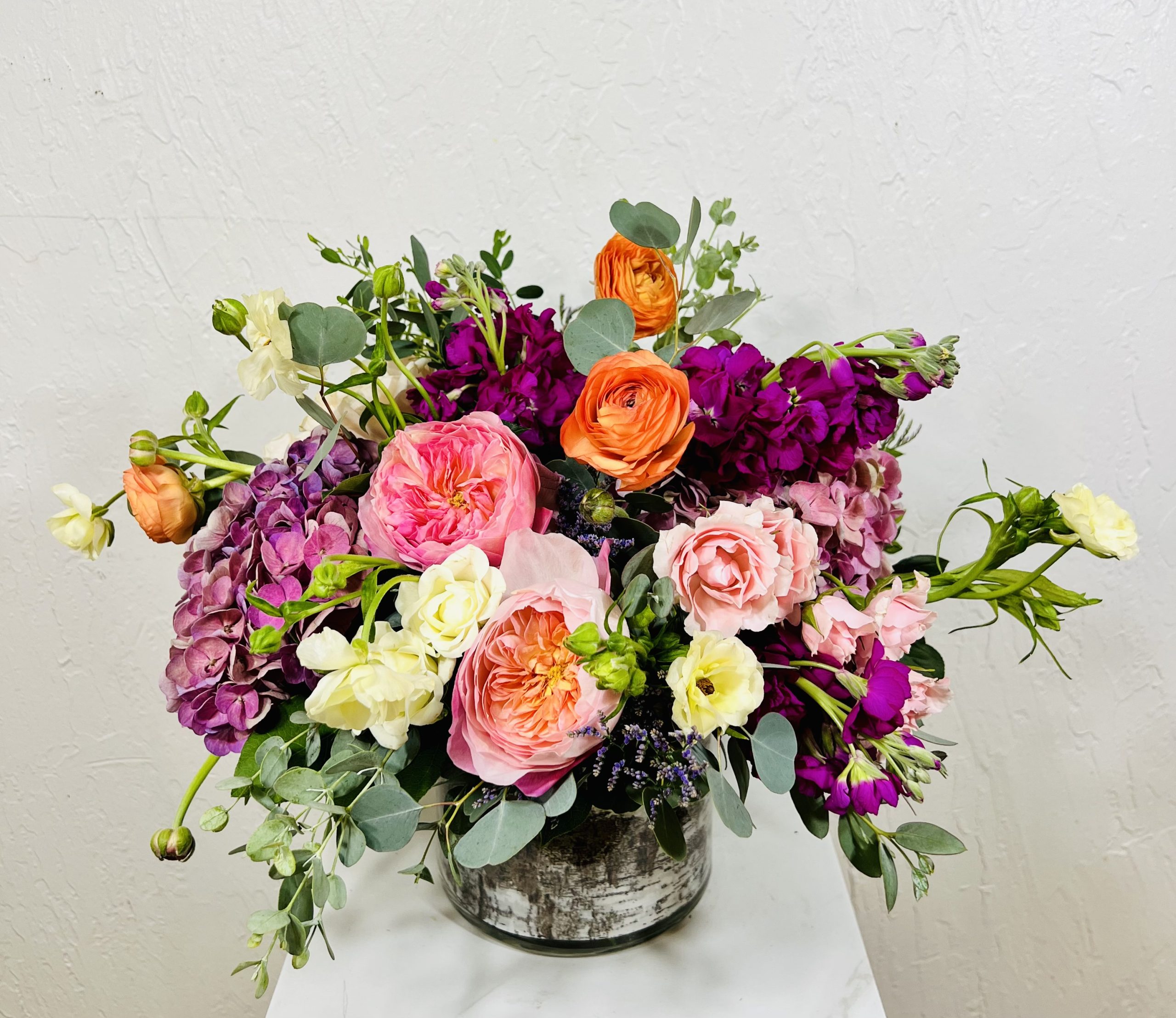 Loose and flowing best describes this garden style arrangement. Butterfly ranunculus, garden roses, stock and hydrangea share the limelight in this lovely design. (Butterfly ranunculus are seasonal and may not be available year round)