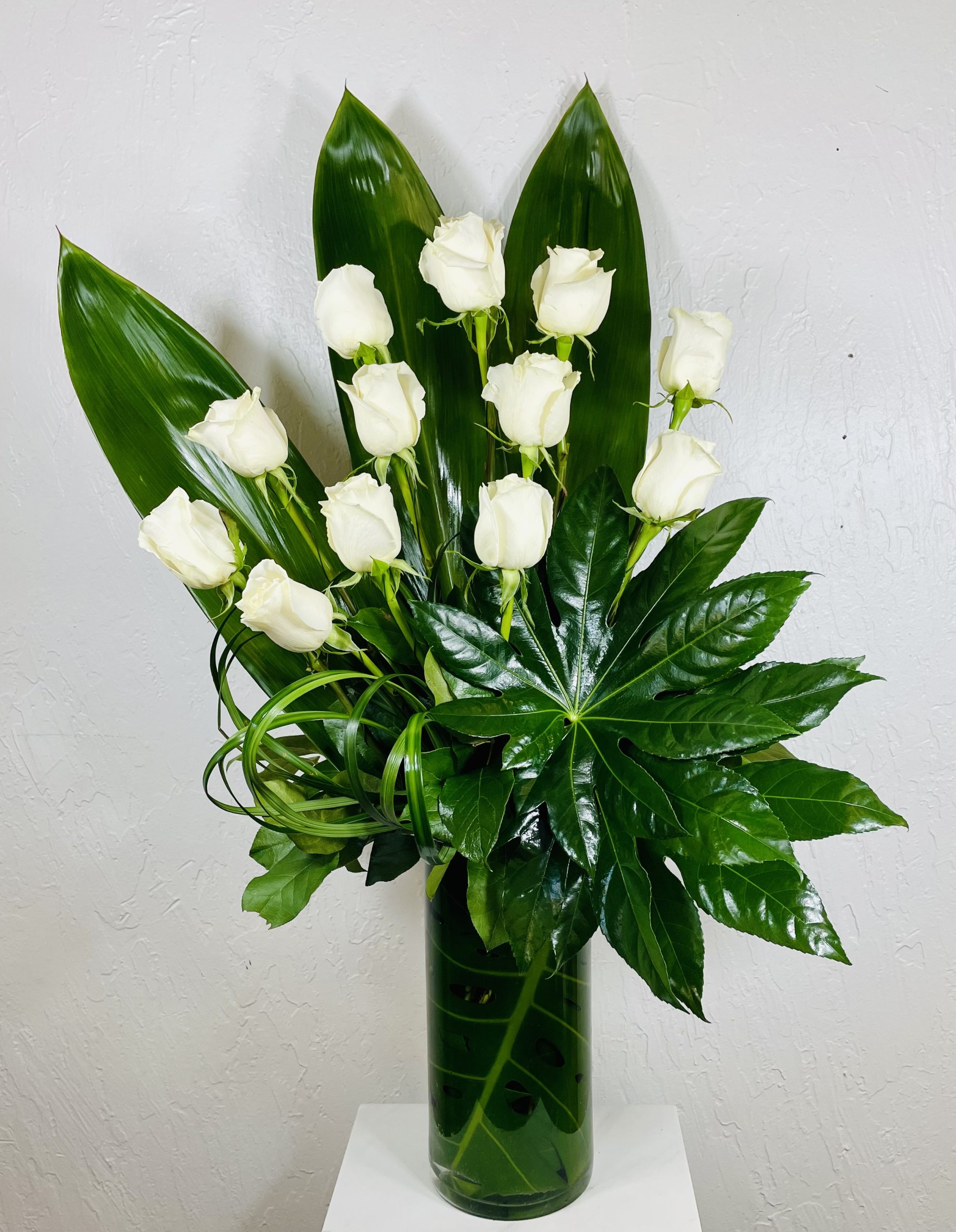 One dozen long stemmed white roses displayed in a contemporary floral design. Vase is 10″ tall x 5″ wide.