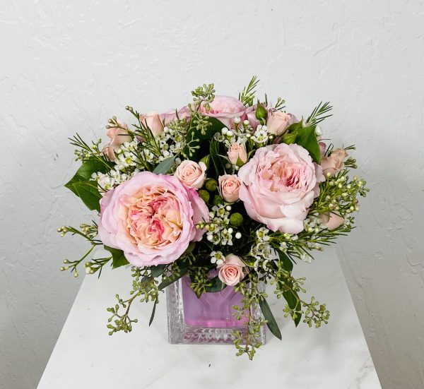 Celebrate the arrival of the little one with a crystal, keepsake baby block with filled with pink garden roses and pink spray roses. Vase is 4″ tall x 4″ wide.