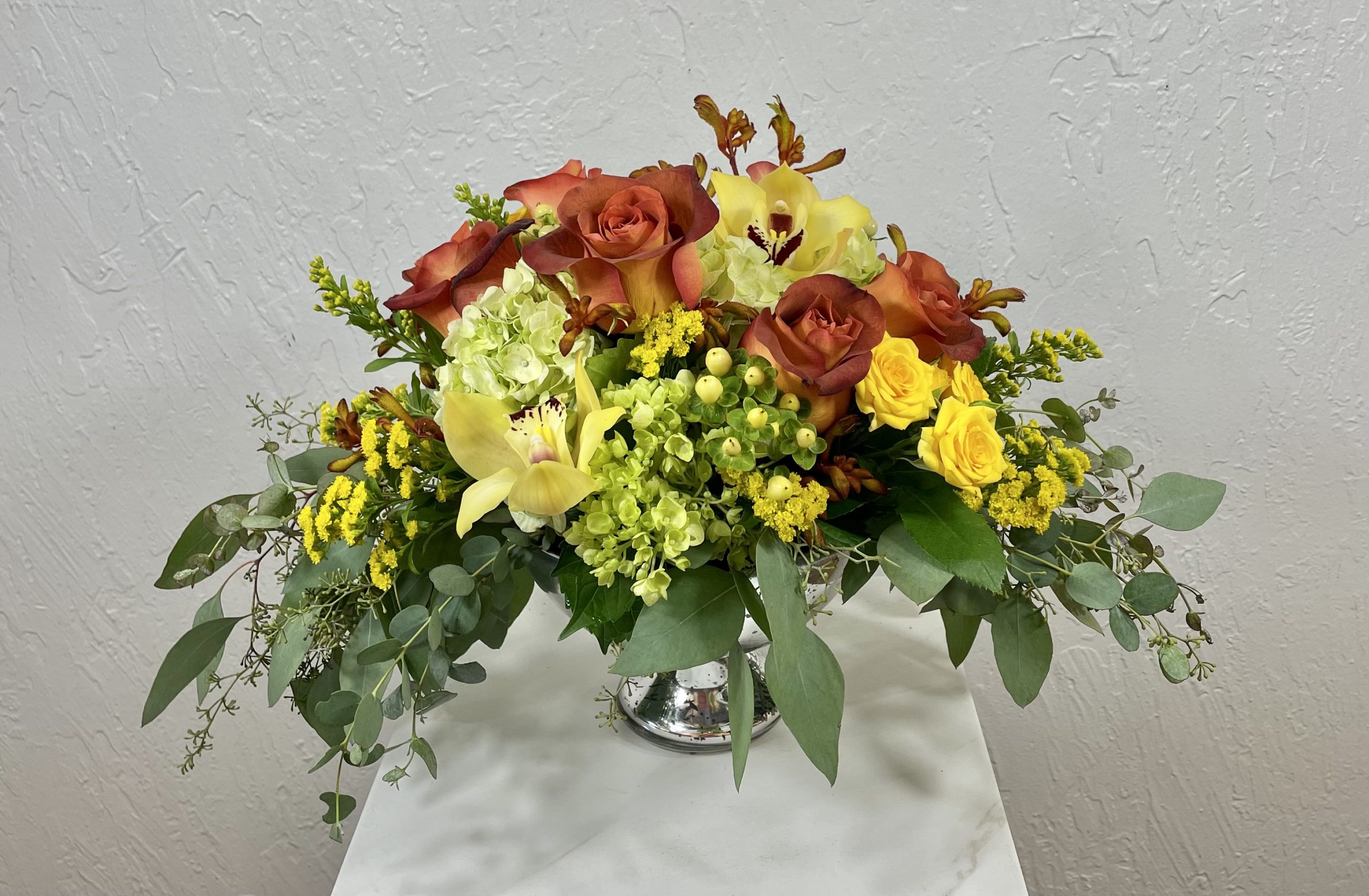 When the evening is one of romance, this centerpiece is lush and lovely. Antique hydrangeas, yellow spray roses, kangaroo paw and coffee break roses in a mercury glass pedestal vase.
