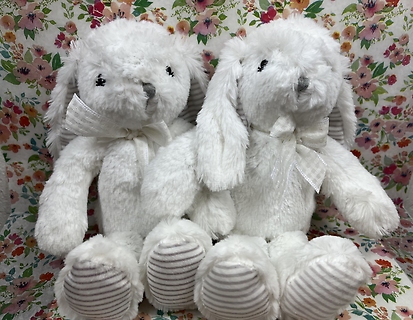 Does your friend or loved one need a friend? Send a lovely plush bunny, so soft and cute with striped extra longs ears and feet. Bunnies may be snow white, or soft grey.