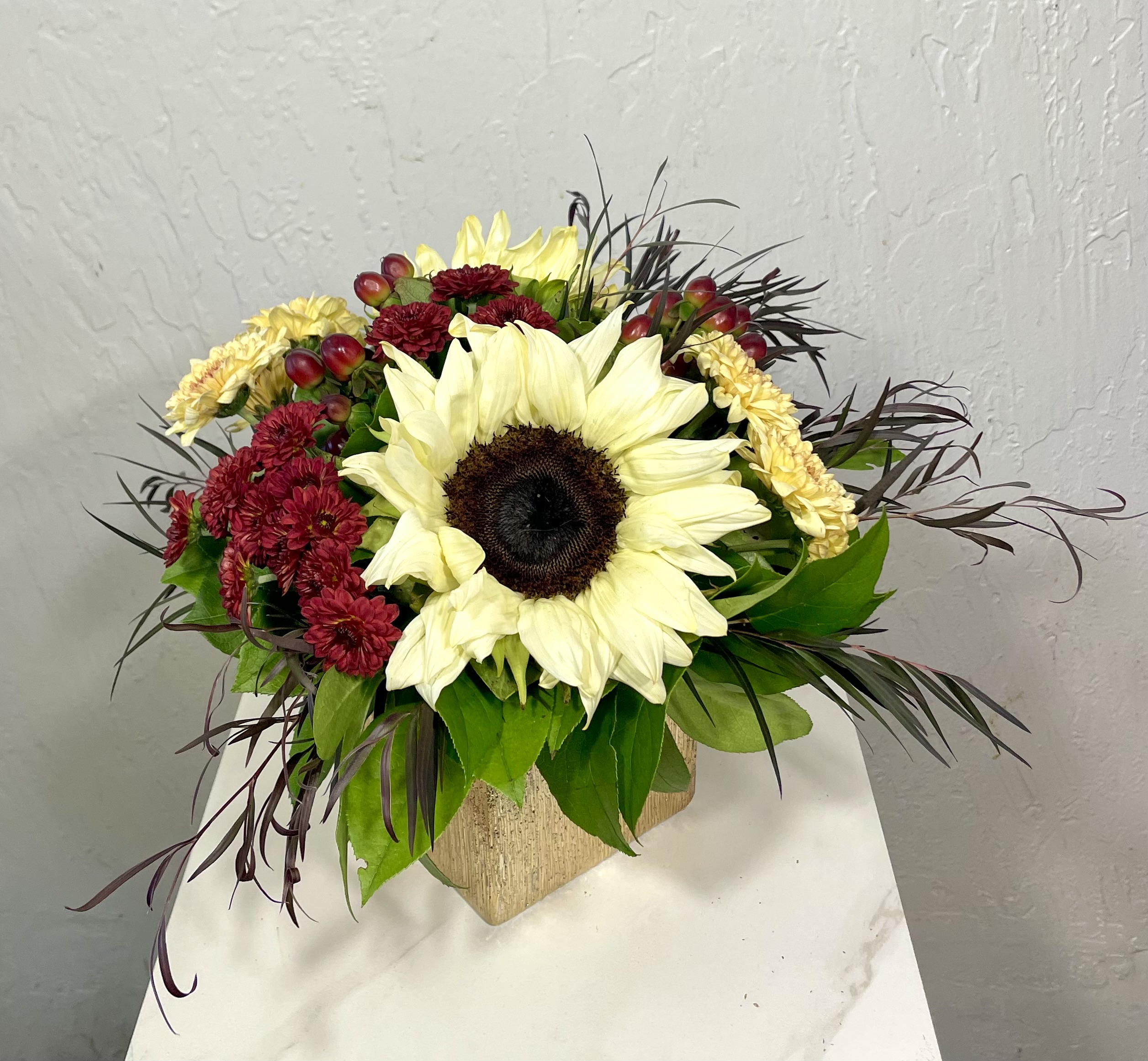 Sunflowers for a table set for two! A golden cube vase with white sunflowers, cream cushion poms, burgundy hypericum, and burgundy button mums. Designed in house by our own talented Andi!