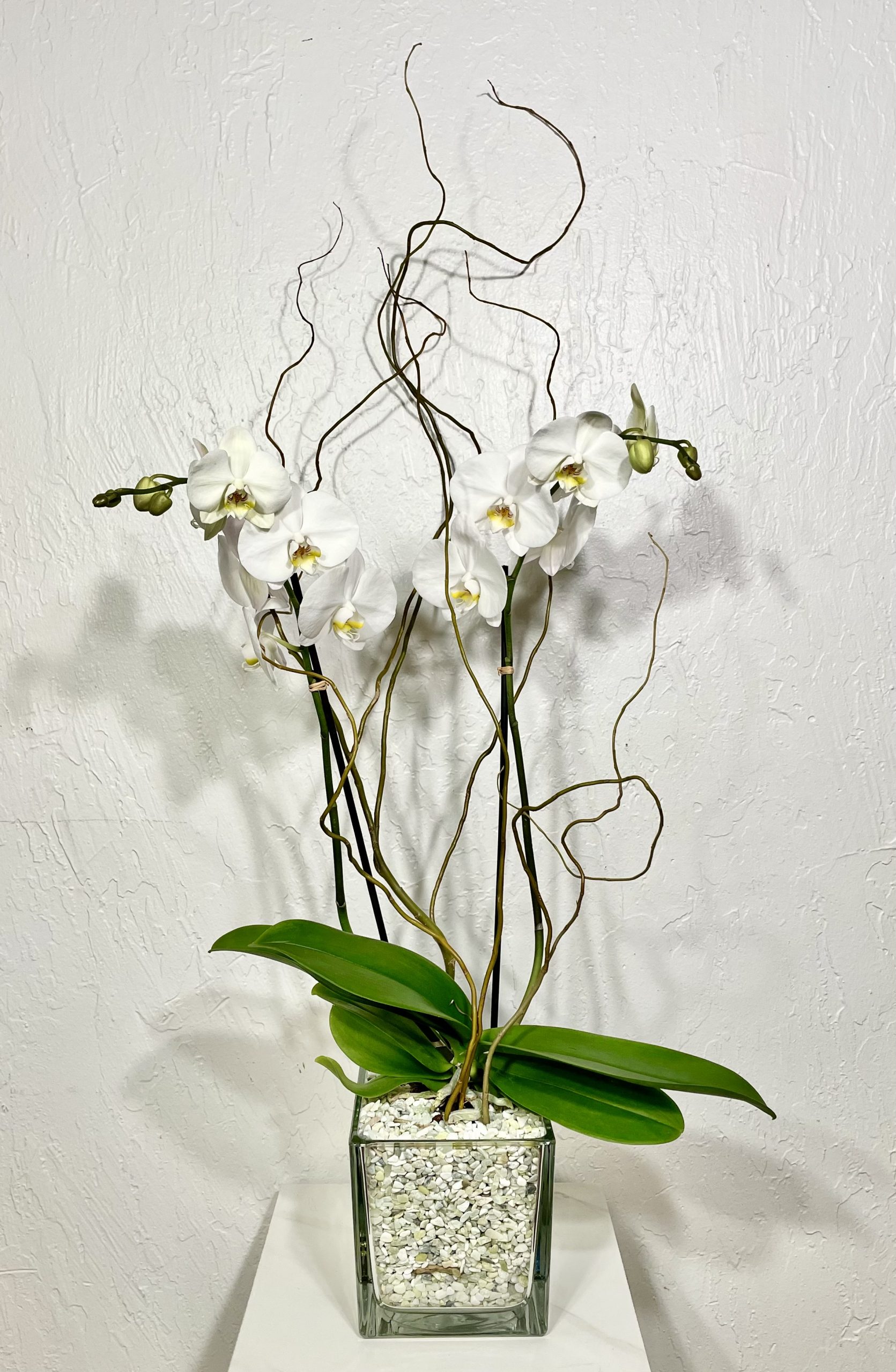 Beautiful Phalaenopsis Orchid plant submerged in jade green rocks with a curly willow trellis. (Double-stem orchid and color of rock depends on availability)