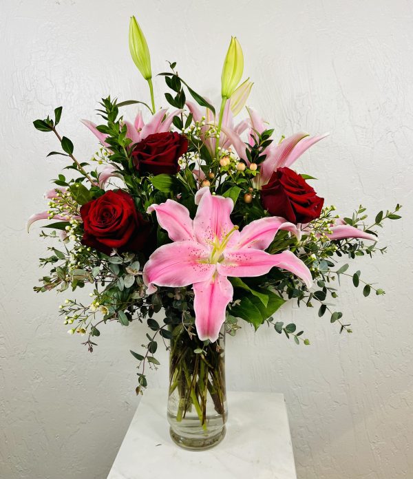 All around bouquet in a tall vase with beautiful red roses complemented by pink oriental lilies, pink hypericum berries, wax flowers and premium greens.