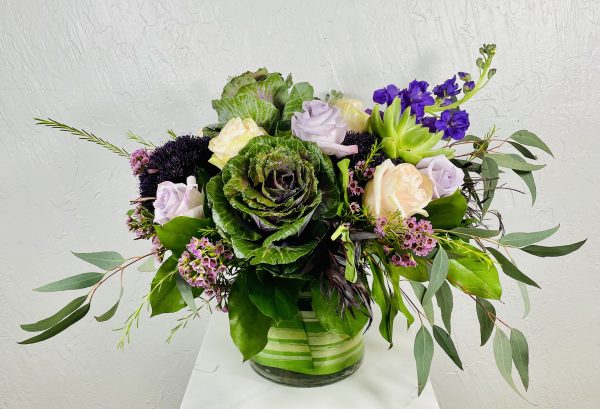 This contemporary pairing of ornamental kale and an attractive echeveria succulent take center stage when complimented with multicolor roses, colorful purple trick and the sweet fragrance of stock!