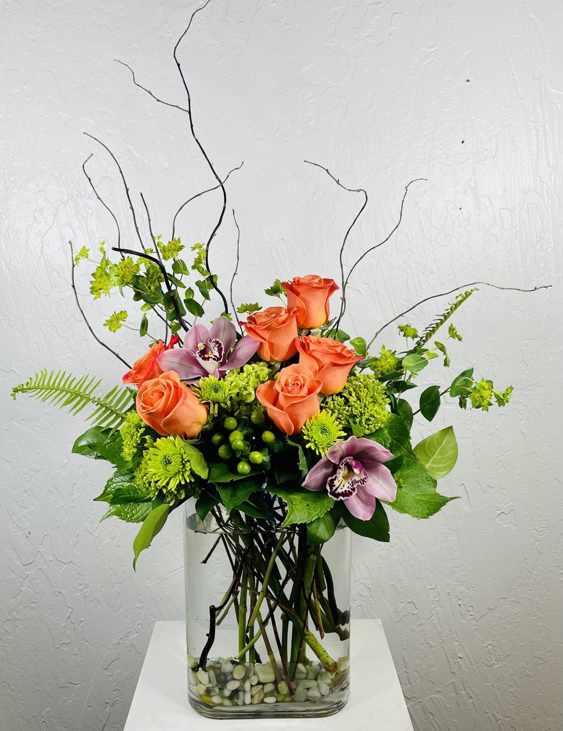 A great way to tell someone “I’m thinking of you”. Orange roses, green mini hydrangea, pink cymbidium orchids and more in a modern vase.