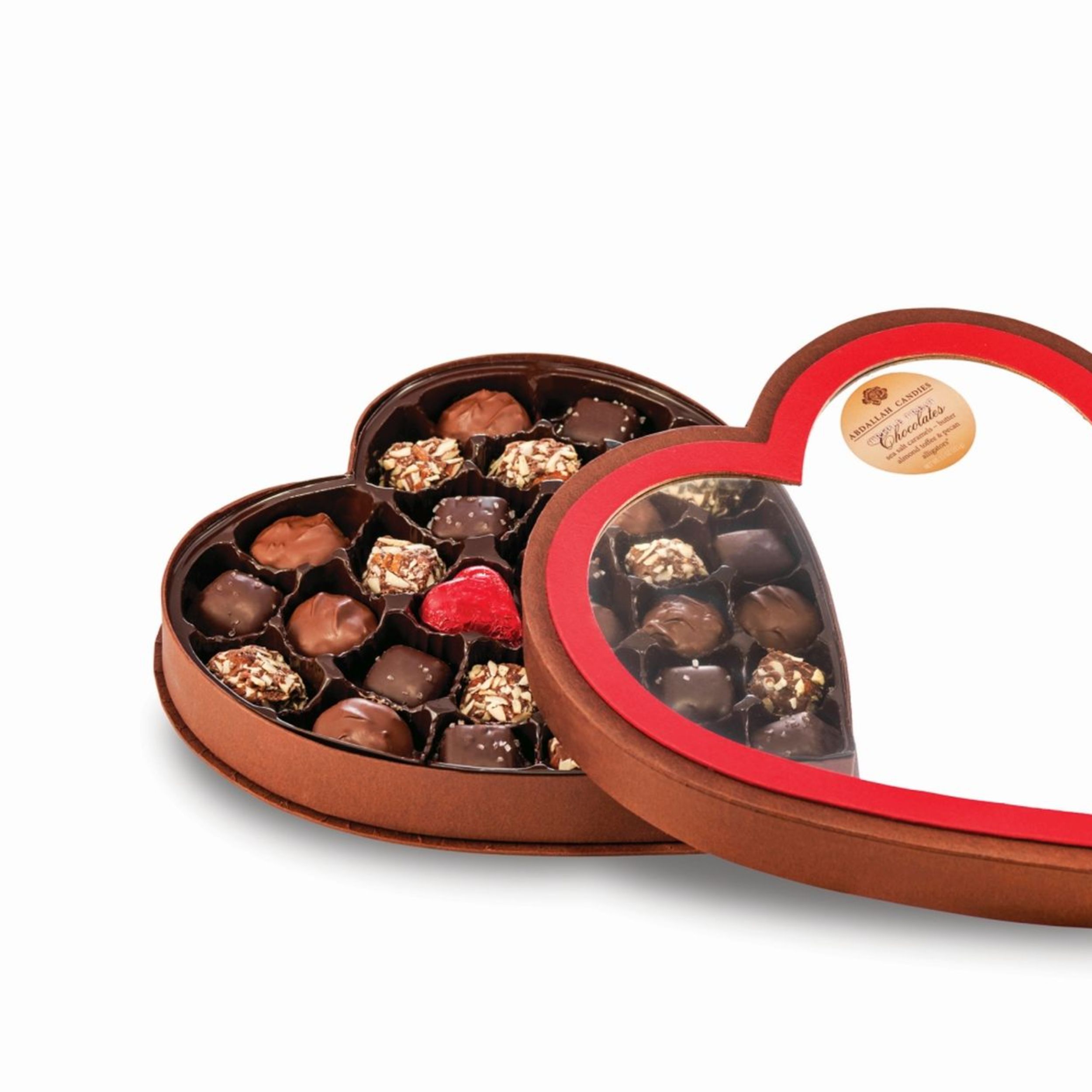 This heart box includes a variety of the most popular caramel and toffee chocolates. Including Sea Salt Caramels, Butter Almond Toffee, and Alligators. 11 oz.