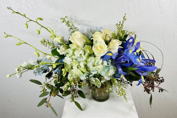 A graceful composition of white orchids, roses, iris, blue hydrangeas and a hint of blue delphinium arranged in an elegant, yet understated design.